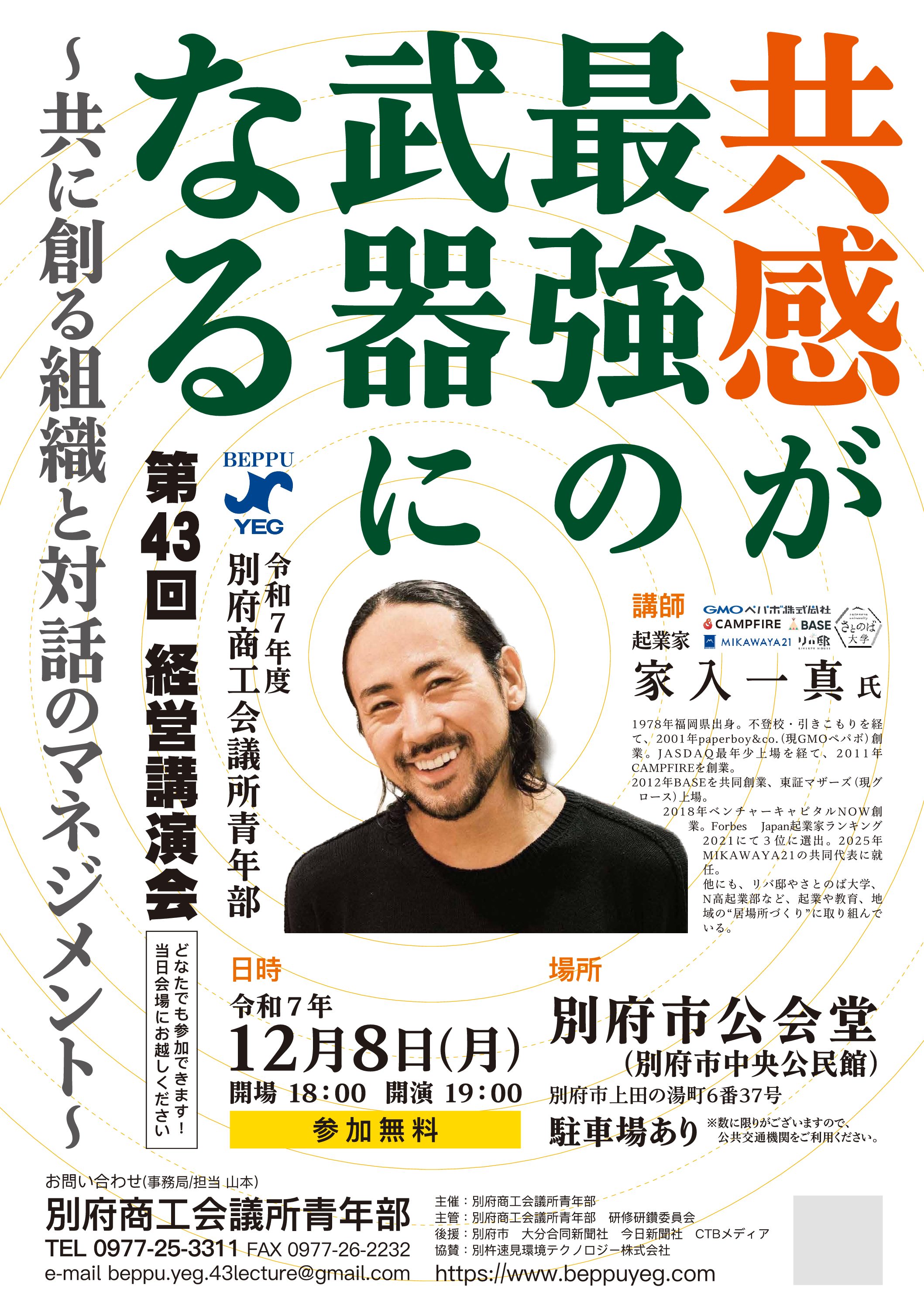 2025年12月8日(月)に開催される別府商工会議所青年部 第43回経営講演会にて、家入が登壇いたします。